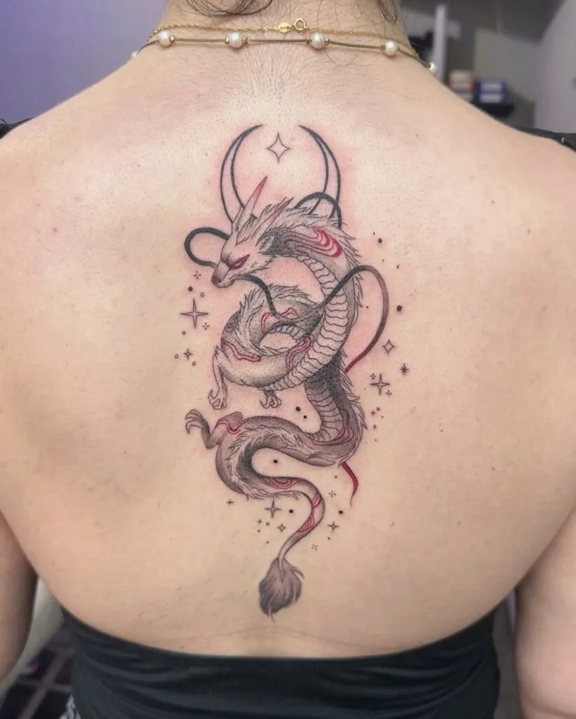 Surrounding stars and a crescent moon frame the design, giving it a celestial touch. The placement emphasizes symmetry and flow, turning the back into a striking canvas that captures Haku’s elegance and ethereal spirit beautifully.