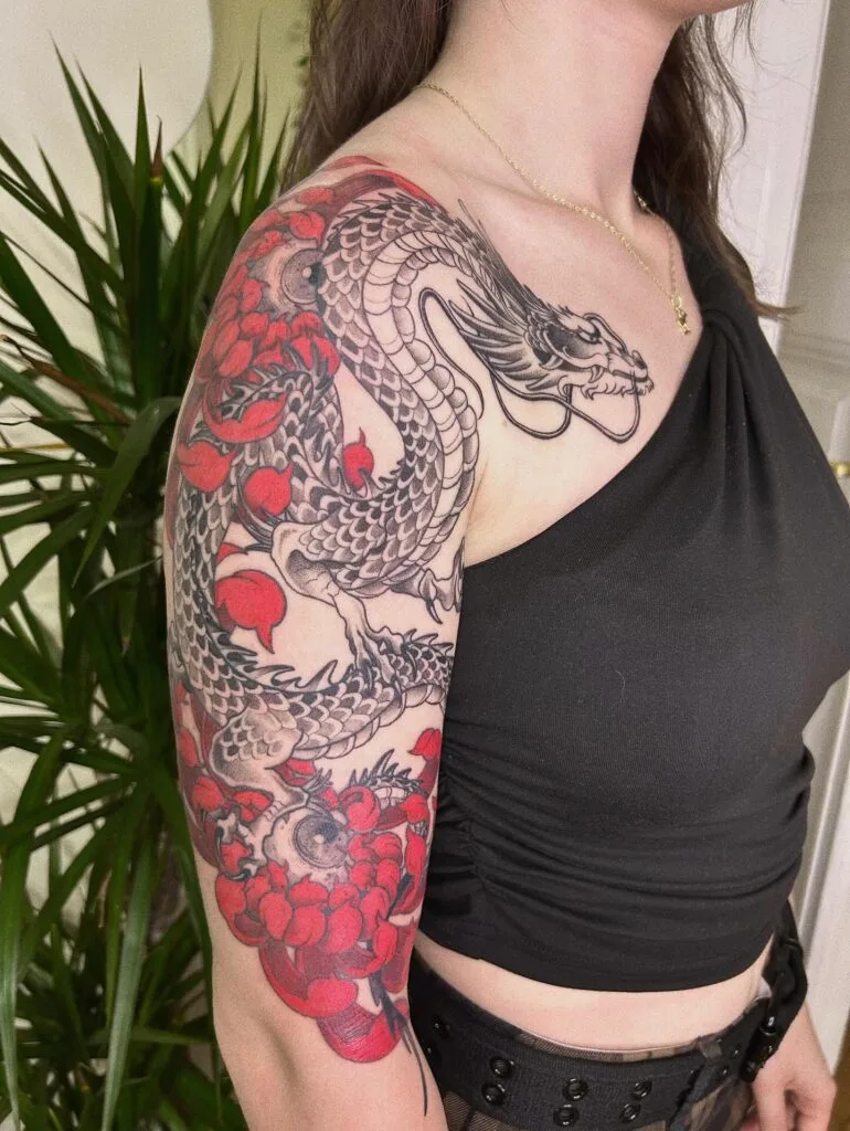 This tattoo shows a Japanese-style dragon coiling around bold red chrysanthemums, extending across the shoulder and upper arm.