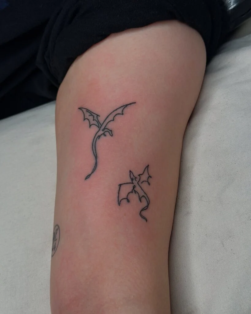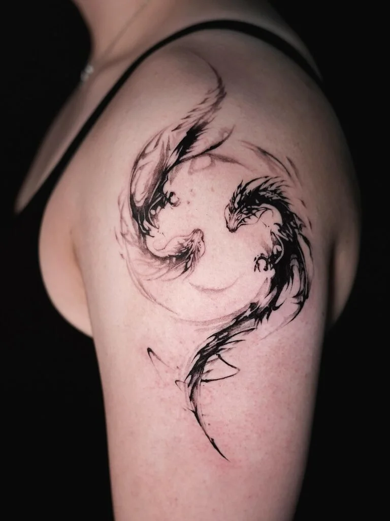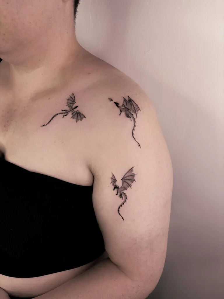 Each dragon is slightly different in posture, creating variation while maintaining balance across the shoulder. The use of fine shading adds depth without overwhelming detail, keeping the tattoo delicate yet expressive.