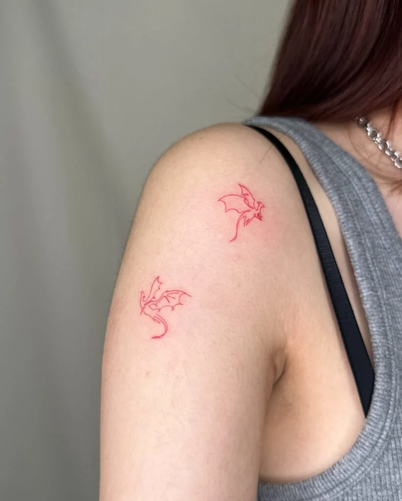 These two red dragon tattoos sit gracefully on the shoulder, drawn with thin, delicate lines.