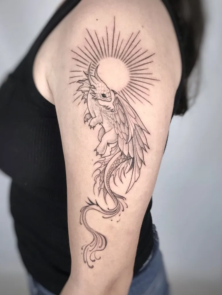 This tattoo shows a dragon on the upper arm, its body flowing gracefully downward with feather-like details in its wings and tail.