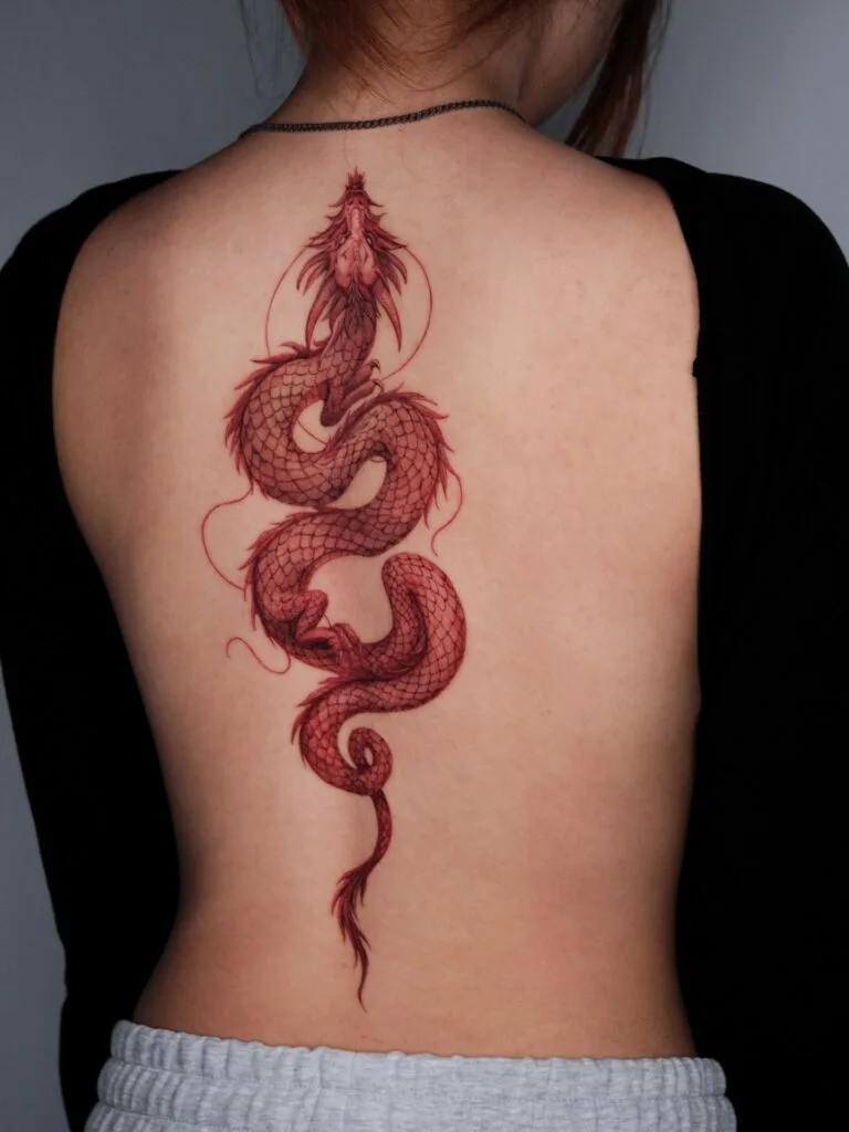 This tattoo features a slender red dragon flowing vertically along the spine, creating an elegant and balanced design.