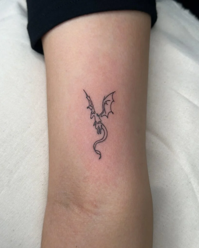 This tattoo features a slim, winged dragon inked with clean black lines on the arm.