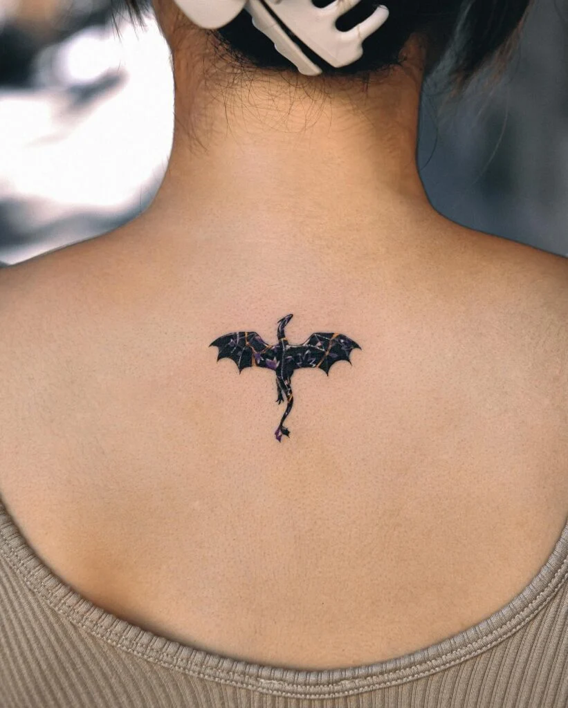 This tattoo features a small dragon with outstretched wings placed neatly at the upper back’s center.