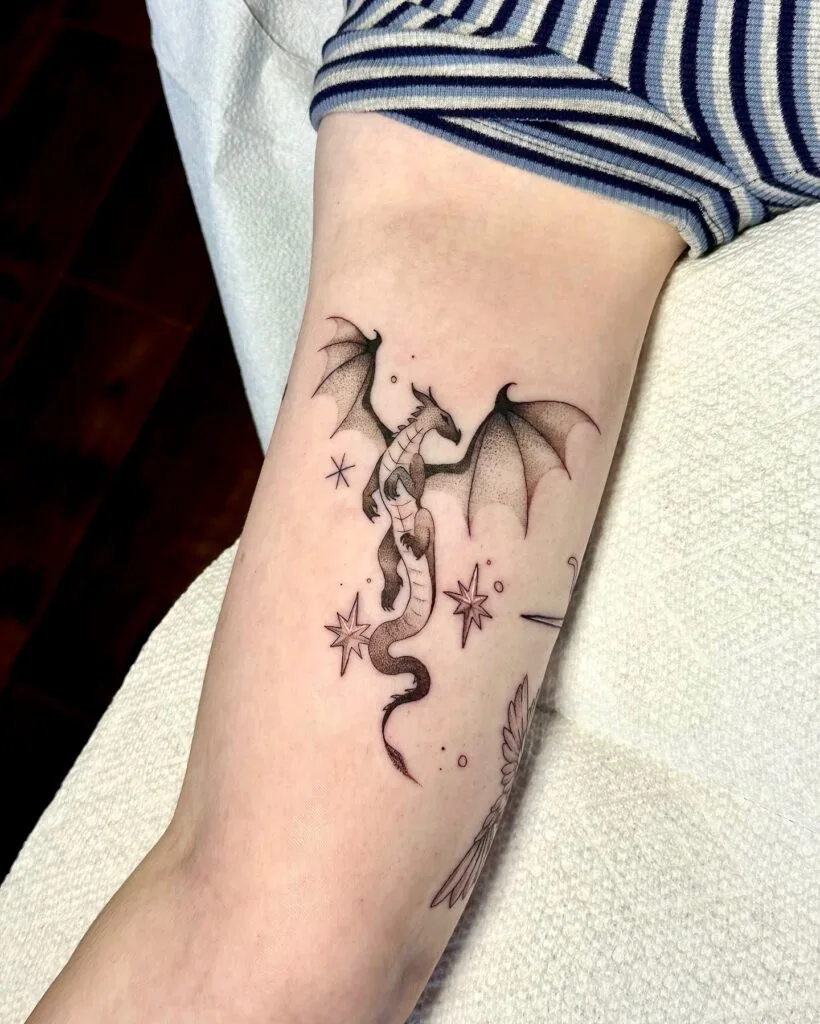 This tattoo shows a small dragon with outstretched wings, placed on the inner arm for subtle impact.