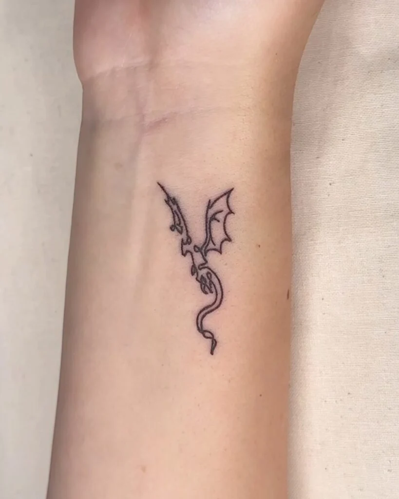 Placed delicately on the wrist, this tiny dragon tattoo uses fine black lines to highlight its wings and tail.