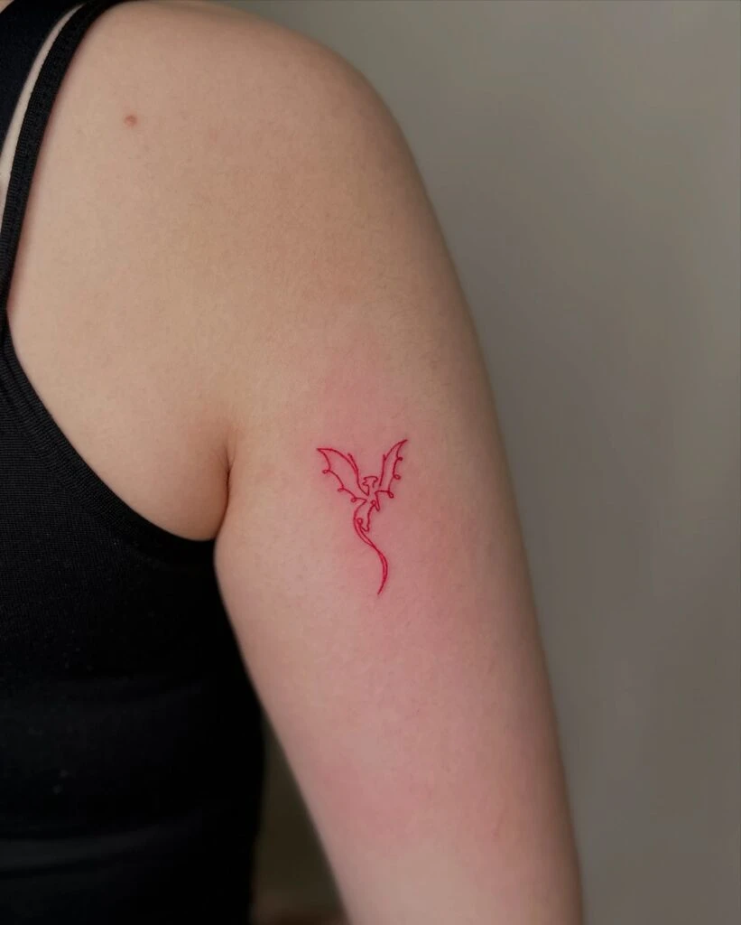 Drawn in bold red ink, this small dragon tattoo on the arm is striking yet minimal. The dragon’s wings stretch upward while its slender body trails downward with smooth flow.
