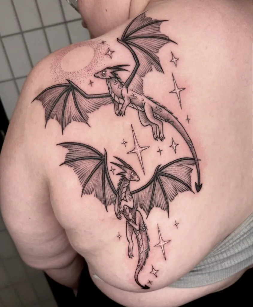 This tattoo features two dragons in flight across the upper back, surrounded by stars and a softly shaded moon.