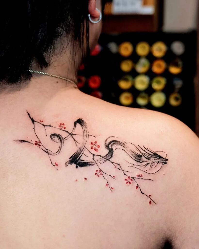 This tattoo features a brushstroke-style dragon flowing across the upper back, blending movement and minimalism.