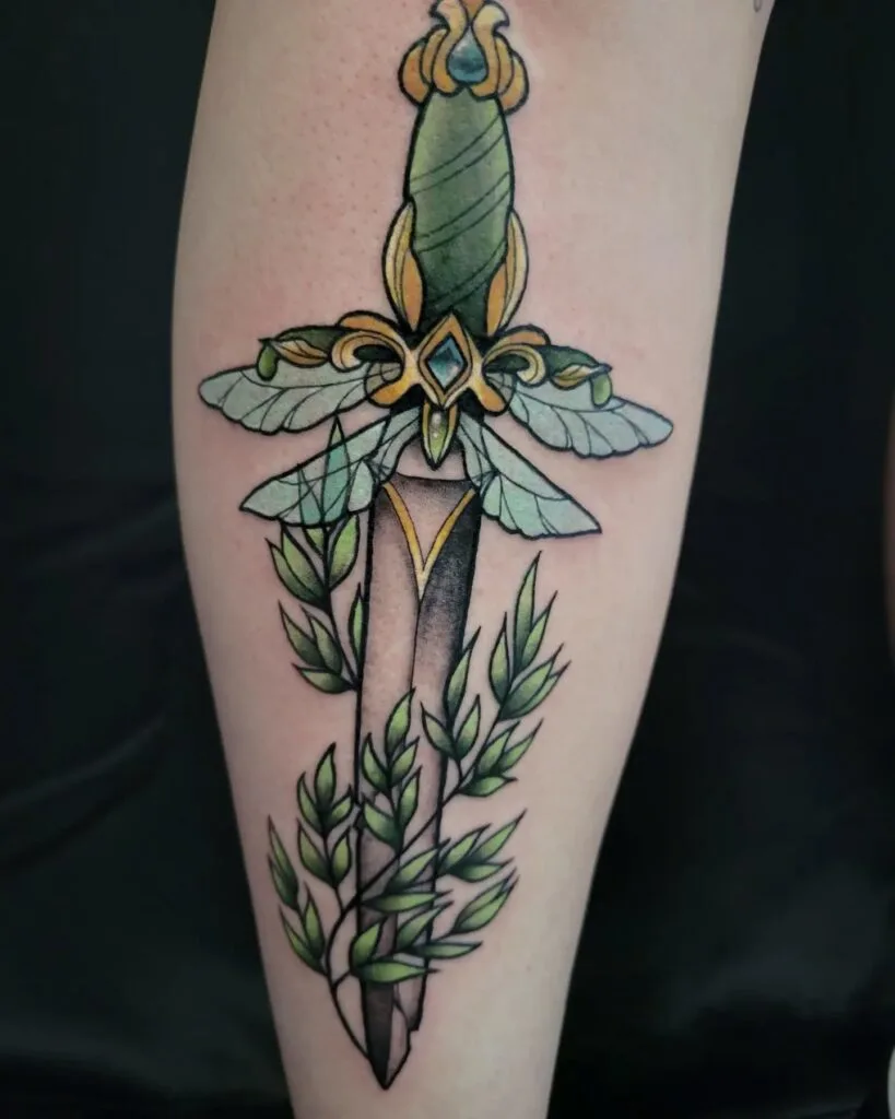This tattoo shows the distinctive Ah Shin dagger decorated with a jeweled hilt and wrapped in lush green leaves.