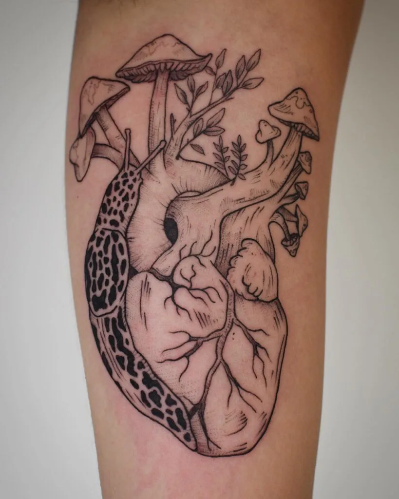 This tattoo displays an anatomical heart sprouting mushrooms, leafy stems, and a spotted banana slug crawling along one side.