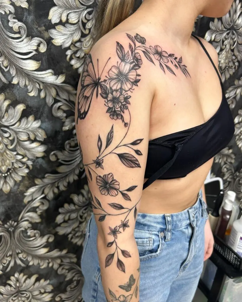Butterfly with Flowing Floral Full Arm Tattoo