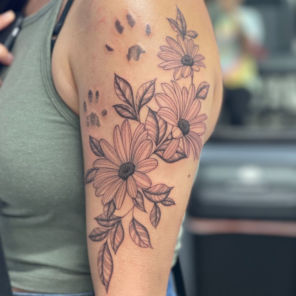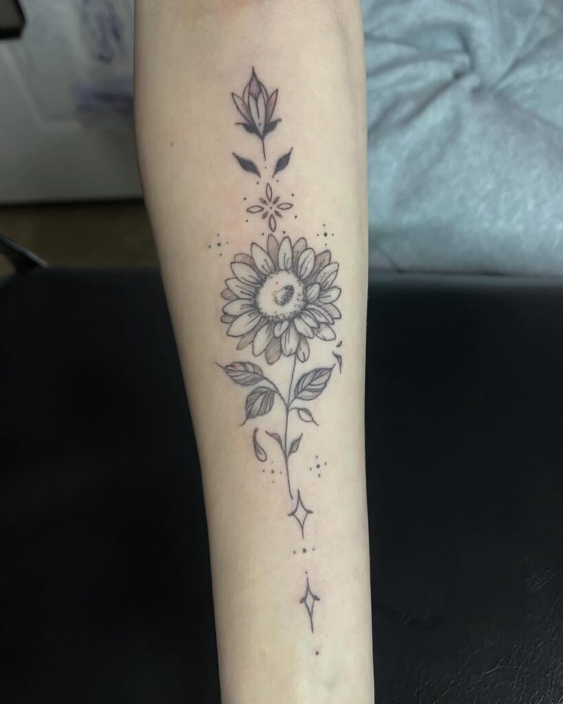 This tattoo is perfect for anyone who loves nature’s warmth and light. A delicate sunflower blooms at the center, its petals finely shaded for a soft, natural look.