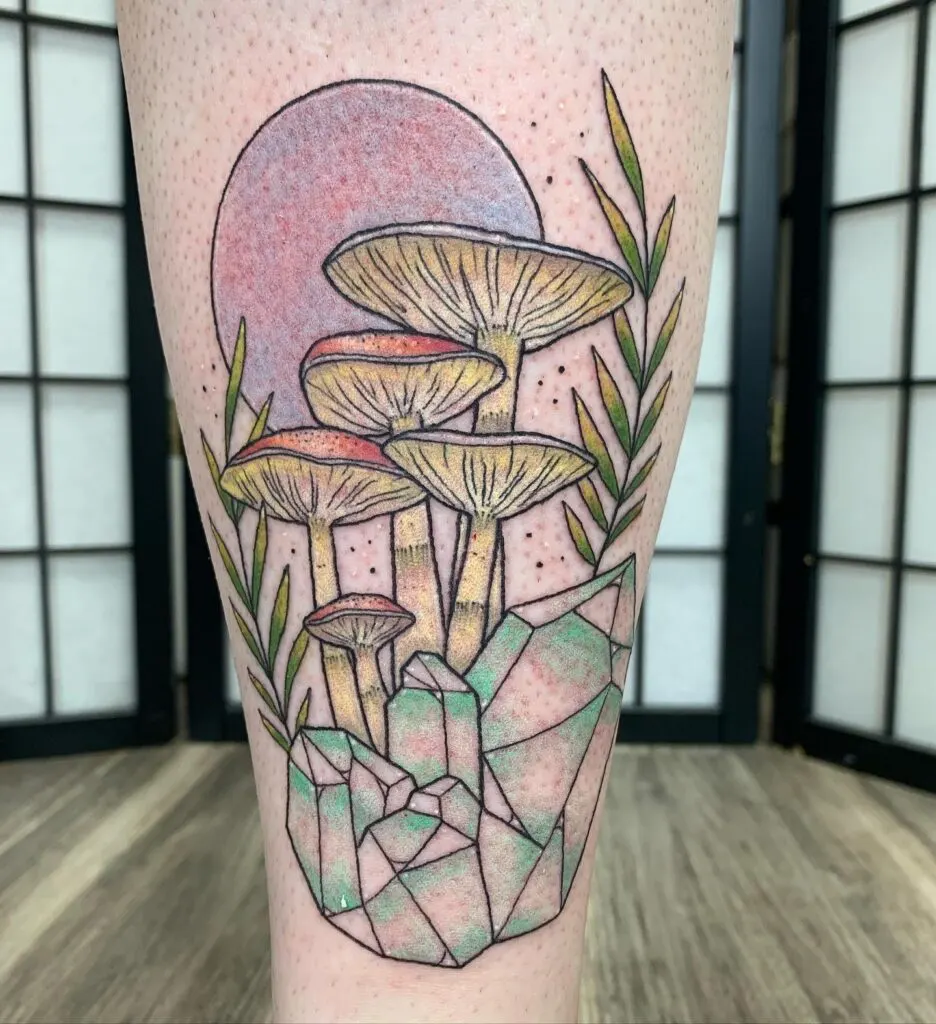 This tattoo combines tall mushrooms, geometric crystals, and delicate leaves set against a soft purple-pink moon.