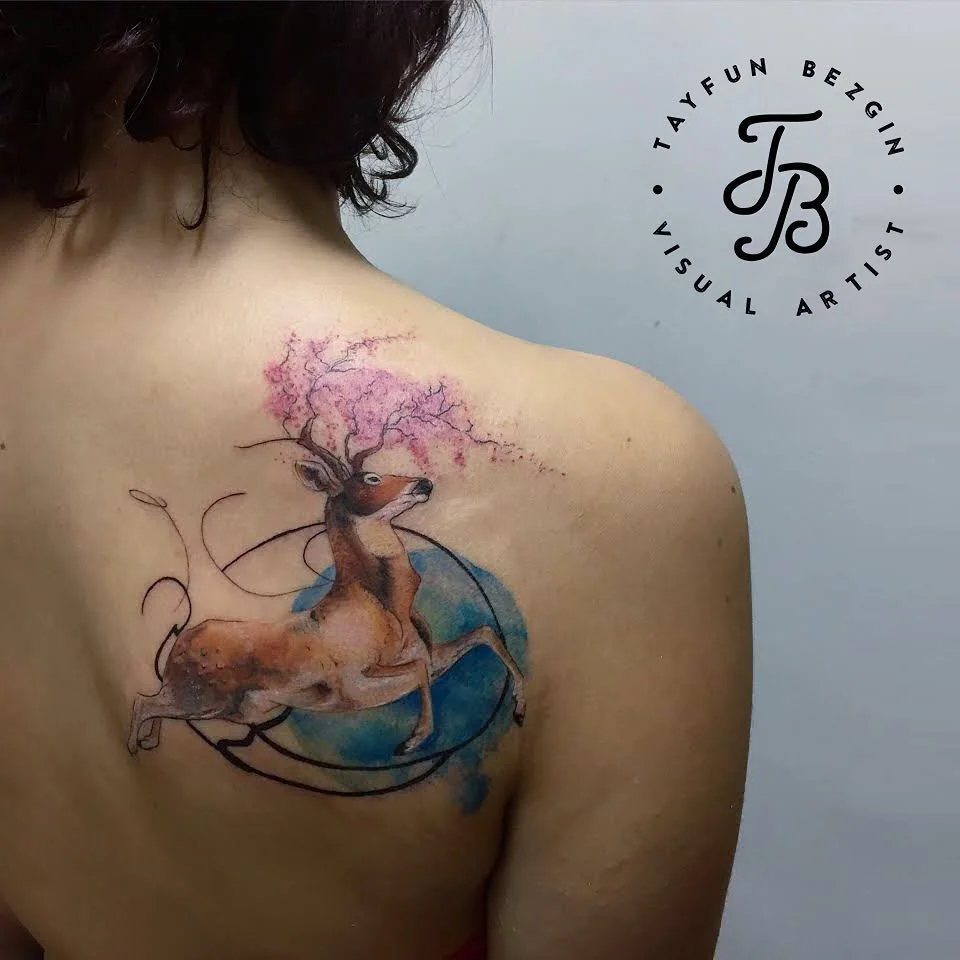 This tattoo portrays a graceful deer leaping in front of a blue watercolor Earth, crowned with pink blossoming antlers.