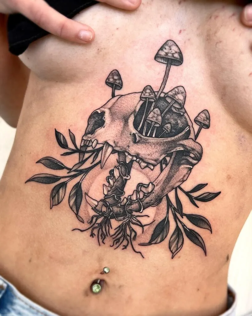 This tattoo is perfect for someone drawn to natural cycles and transformation. A detailed cat skull lies at the center, with mushrooms sprouting from within and leafy branches extending outward.