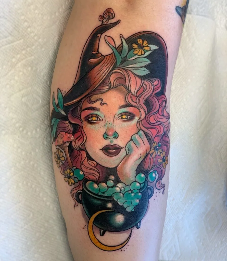 This tattoo presents a dreamy witch with glowing golden eyes and curly rose-colored hair, leaning on a bubbling cauldron.