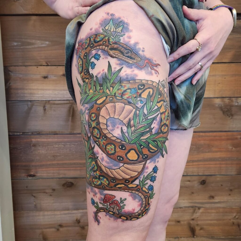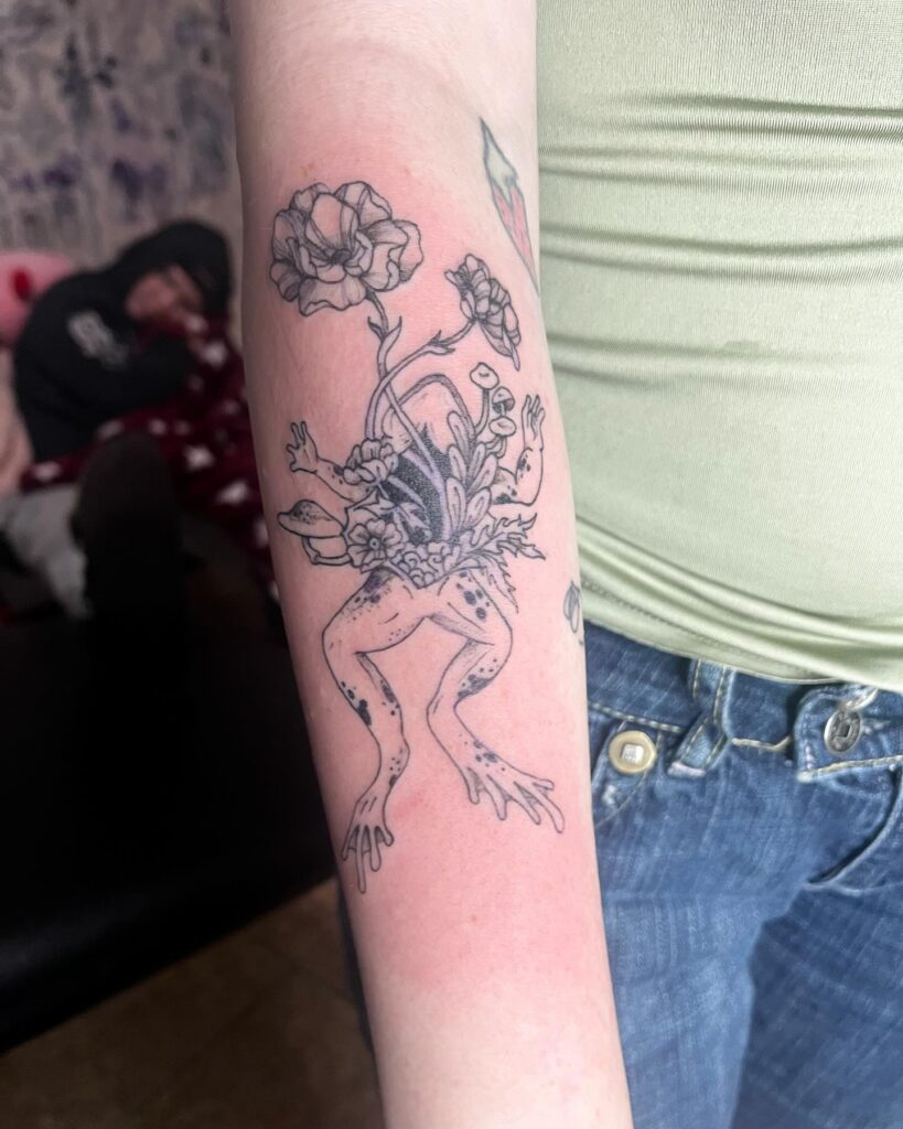 This tattoo is perfect for anyone who appreciates imaginative, nature-inspired art. A frog’s lower body supports a flourishing arrangement of flowers, leaves, and tiny mushrooms growing from its back.