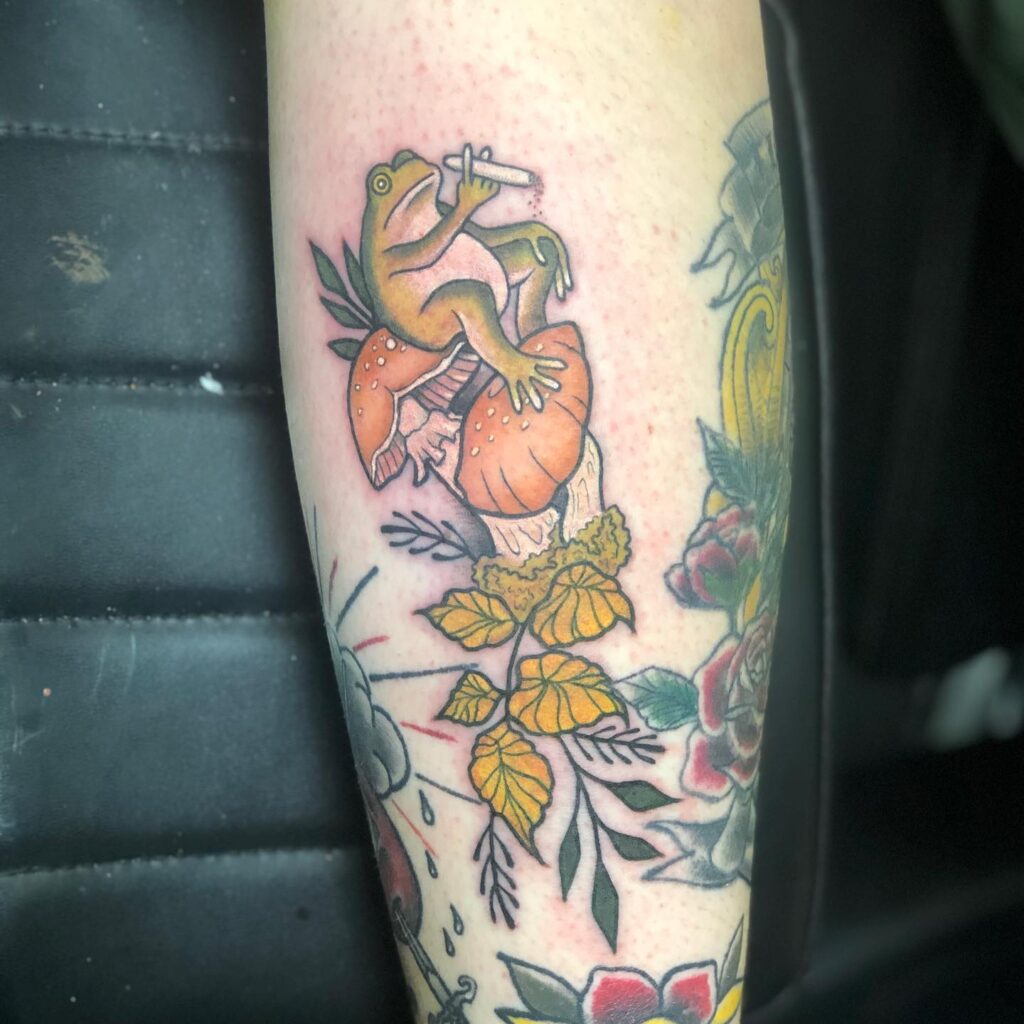 This tattoo features a playful green frog sitting on a bright orange mushroom, holding a lit cigarette.
