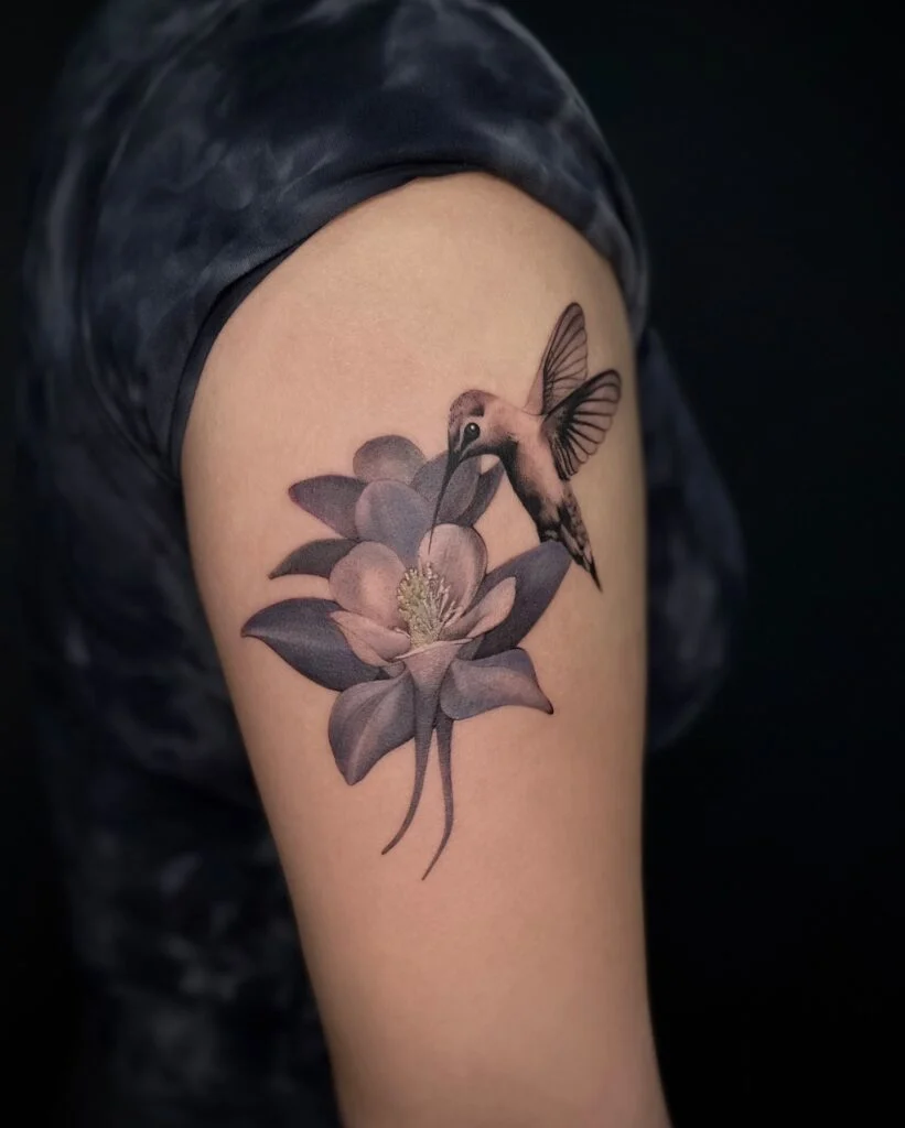This tattoo shows a lifelike hummingbird drinking nectar from a soft purple flower with layered petals.