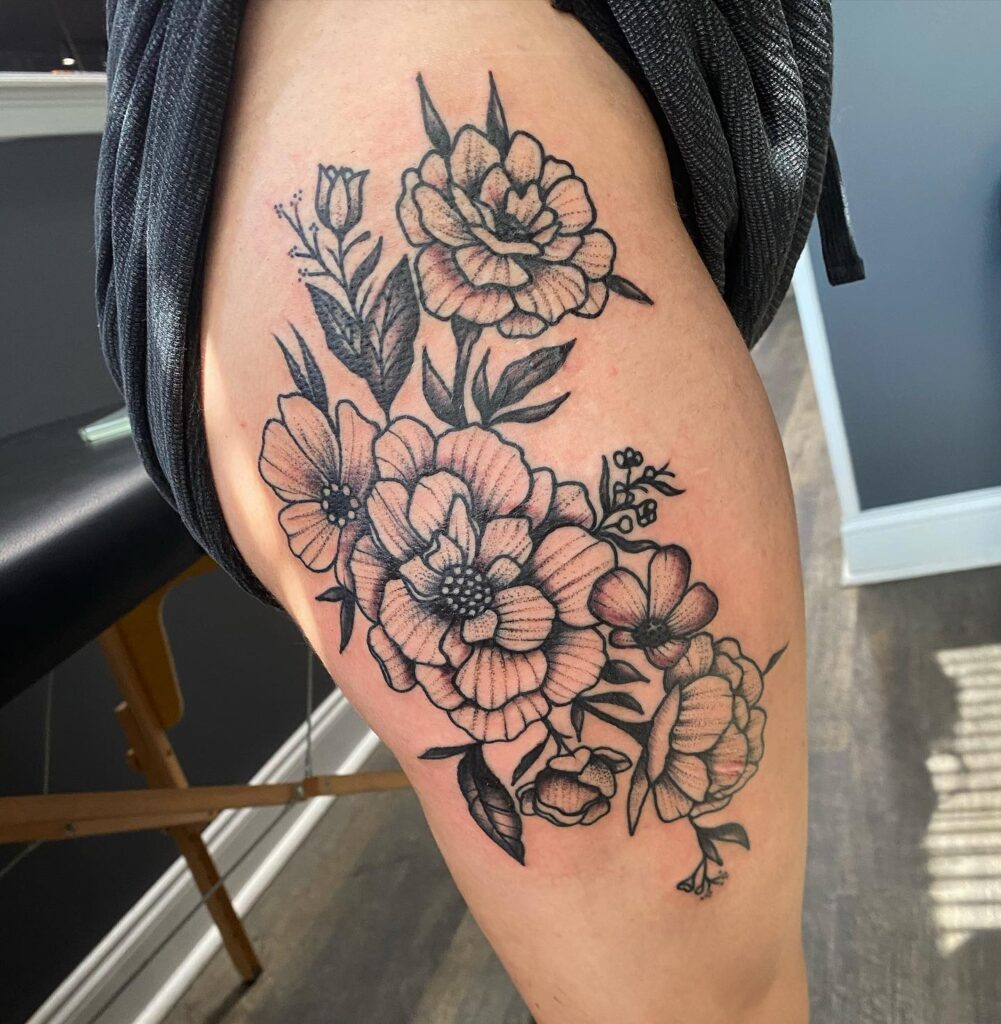 Crisp black outlines define each petal, while gentle dotwork highlights create dimension without overpowering the design. The arrangement follows the thigh’s curve, giving the piece an elegant, organic movement.