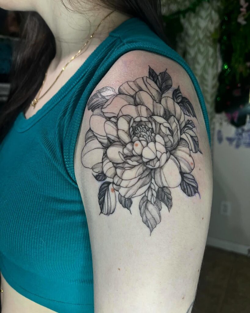 A massive peony blooms across the shoulder, its layered petals beautifully shaded to create natural depth and dimension. Fine black linework enhances each petal’s soft curves, giving the design a lifelike and flowing appearance.