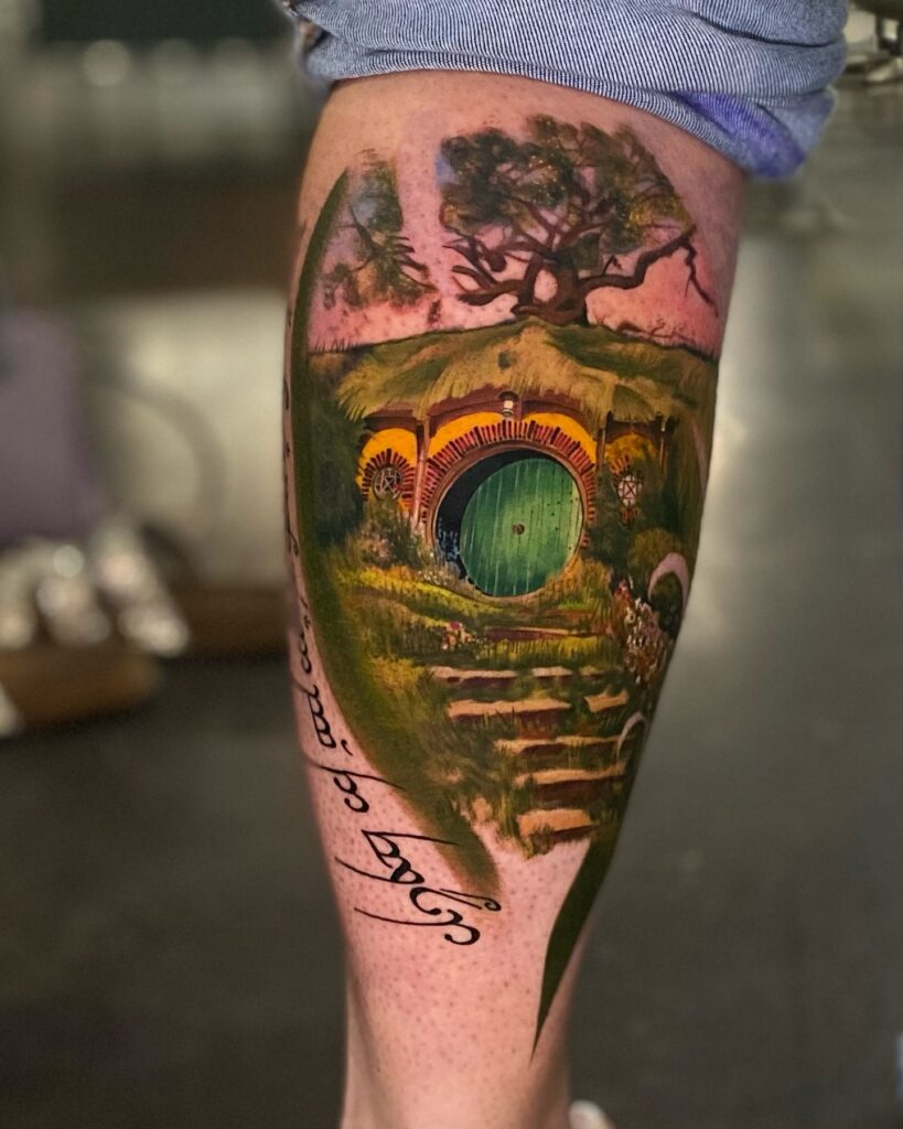 Lord of the Rings Shire Scene with Elvish Script Tattoo
