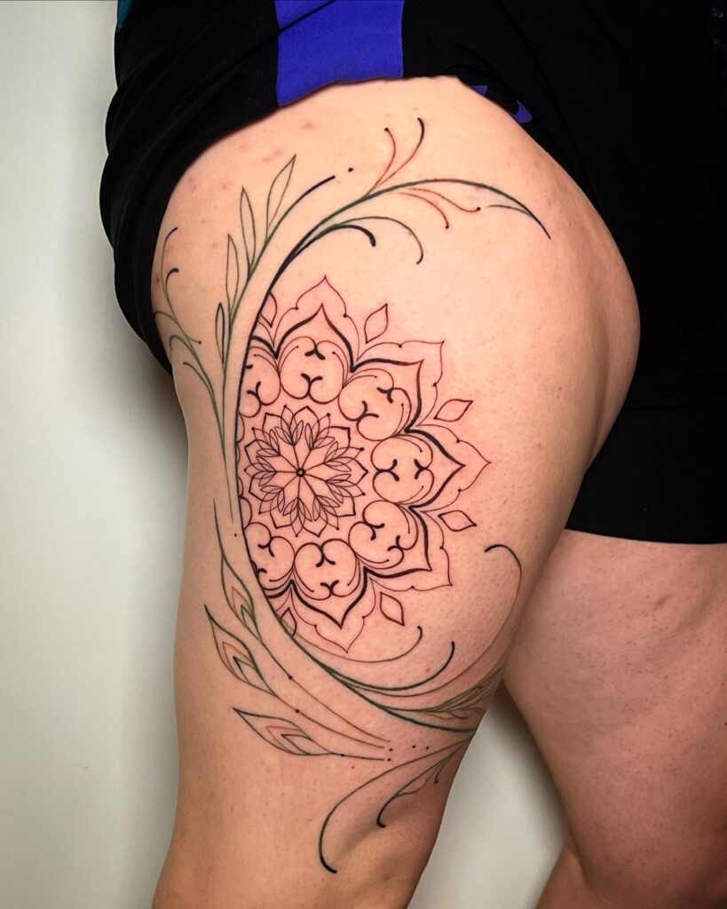 This tattoo features a detailed mandala centered on the thigh, surrounded by graceful, flowing vine accents.
