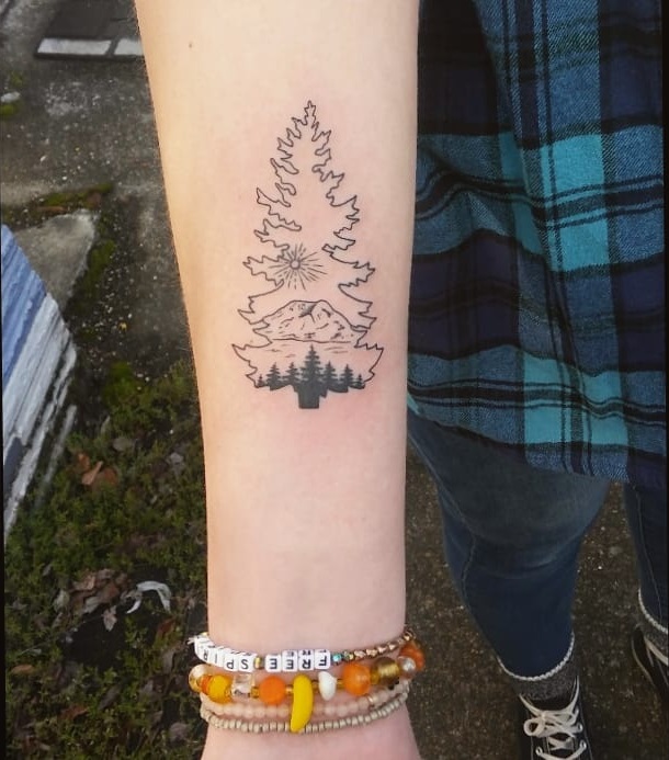 This tattoo frames a mountain and forest landscape inside the outline of a tall pine tree.