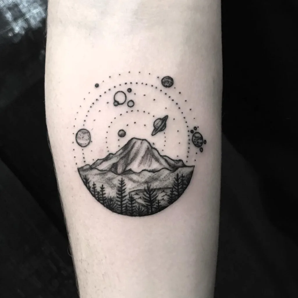 This tattoo presents a forested mountain beneath orbiting planets and dotted celestial paths.