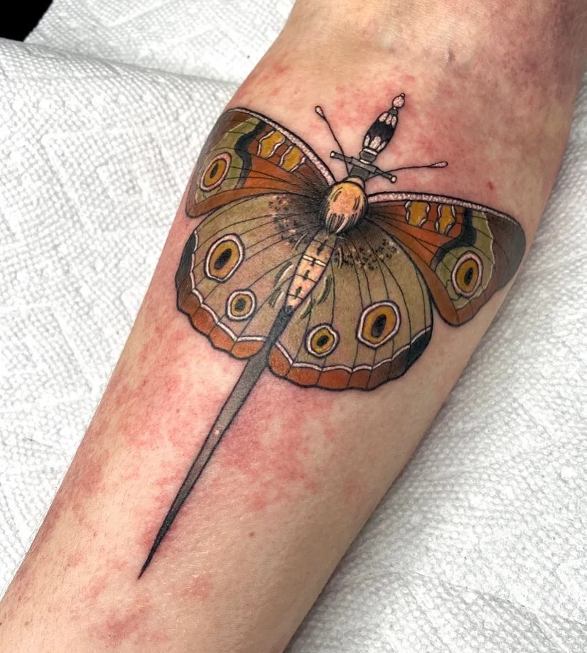 This tattoo is perfect for someone who admires transformation and natural beauty. A vibrant butterfly spreads detailed orange and olive-brown wings decorated with lifelike eye spots.
