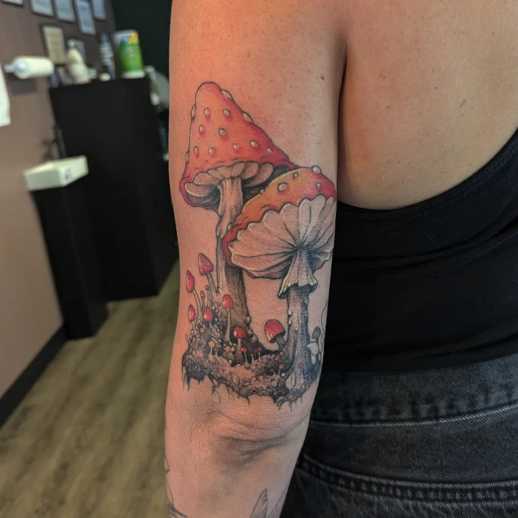 This tattoo shows two large fly agaric mushrooms with vibrant red caps dotted in white, surrounded by smaller mushrooms.