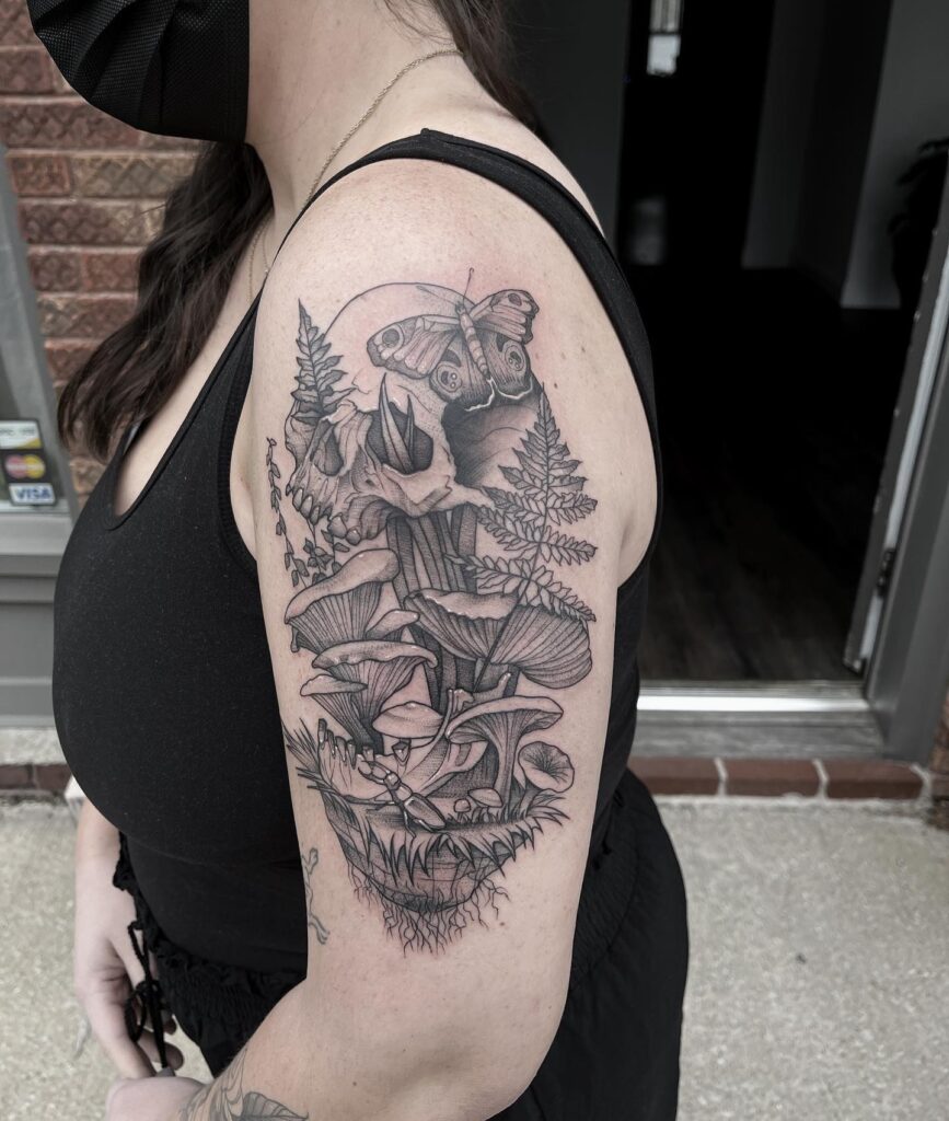 Skull with Mushrooms, Ferns, and Moth Tattoo