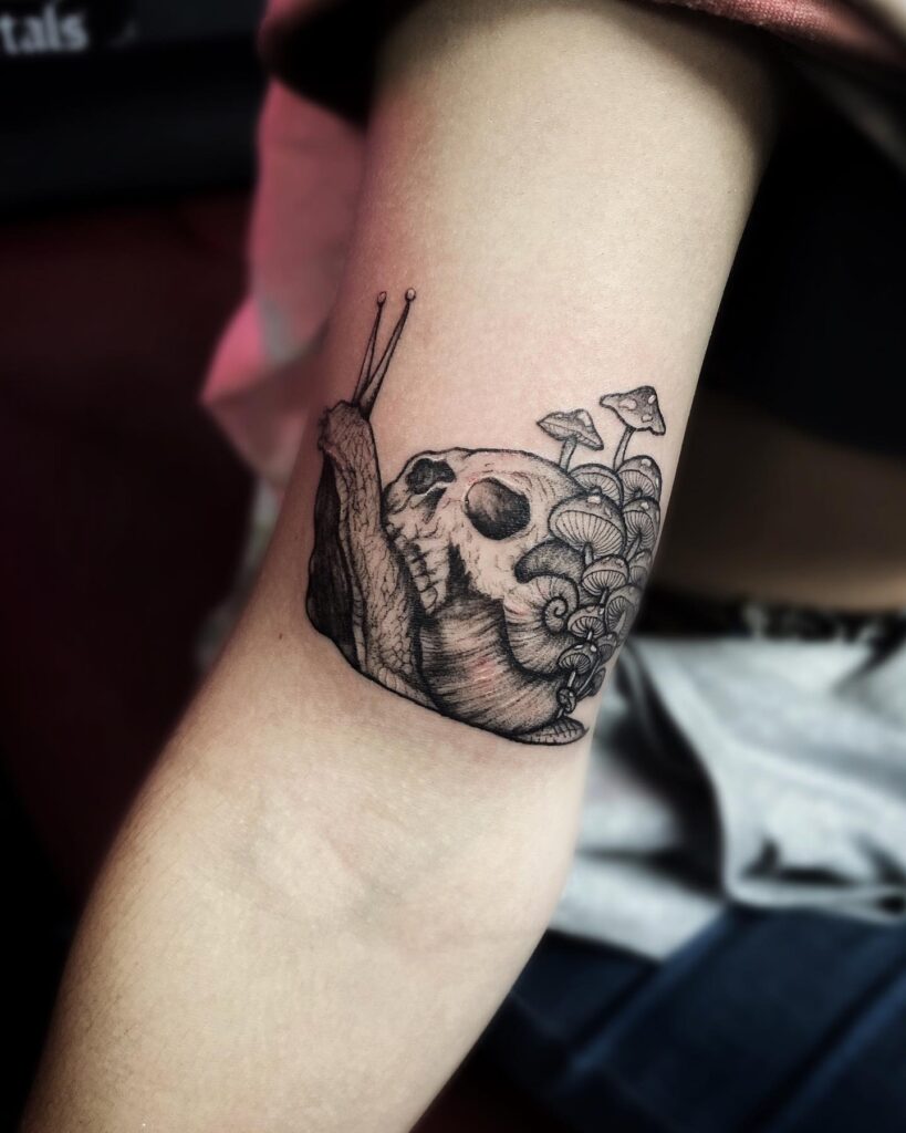 Fine linework and stippled shading bring rich texture to the snail’s body and the fungi’s gills. The skull adds a moody contrast, blending natural decay with woodland growth. Placed on the arm, it uses the skin’s curve to enhance the slow, creeping movement.