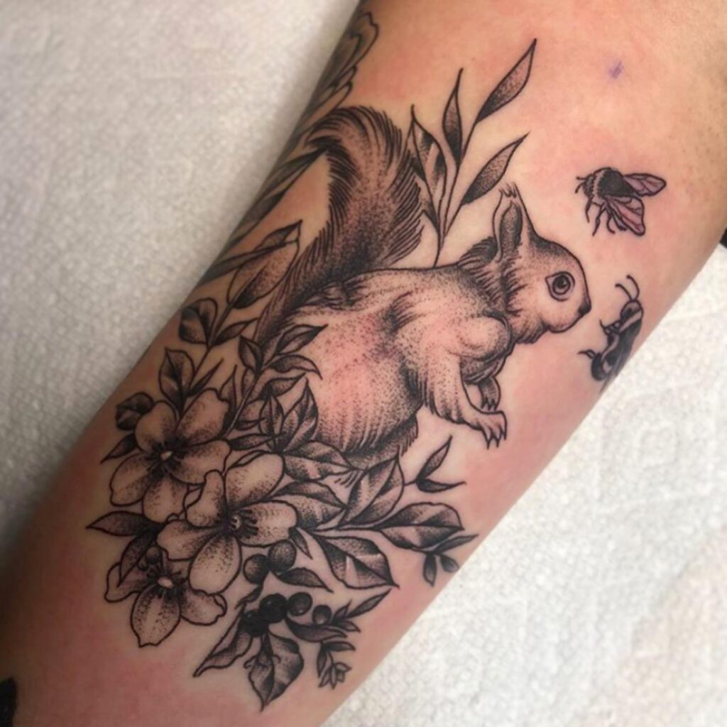 This tattoo shows a lively squirrel surrounded by woodland flowers, leaves, and two buzzing insects.