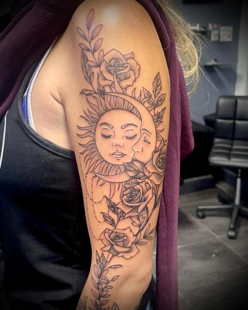 This tattoo shows the sun and crescent moon joined in a peaceful face-to-face embrace, surrounded by roses and leaves.