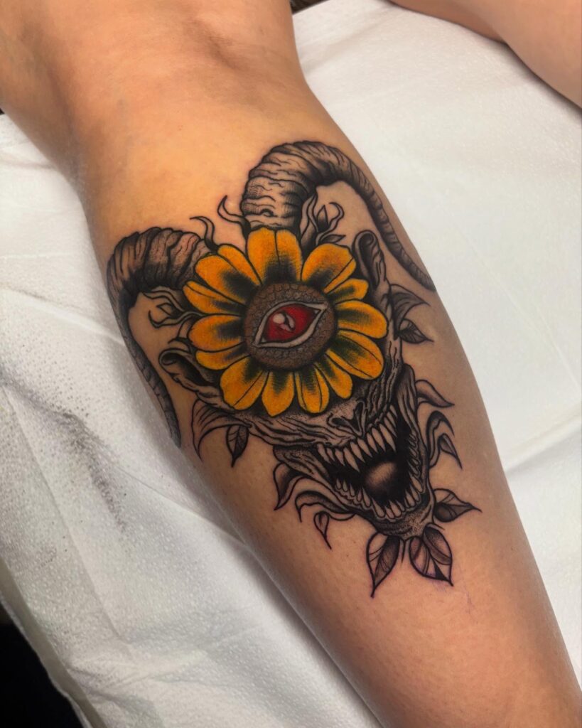 This tattoo mixes a fierce demon skull with curling horns and a bright sunflower framing a red central eye.