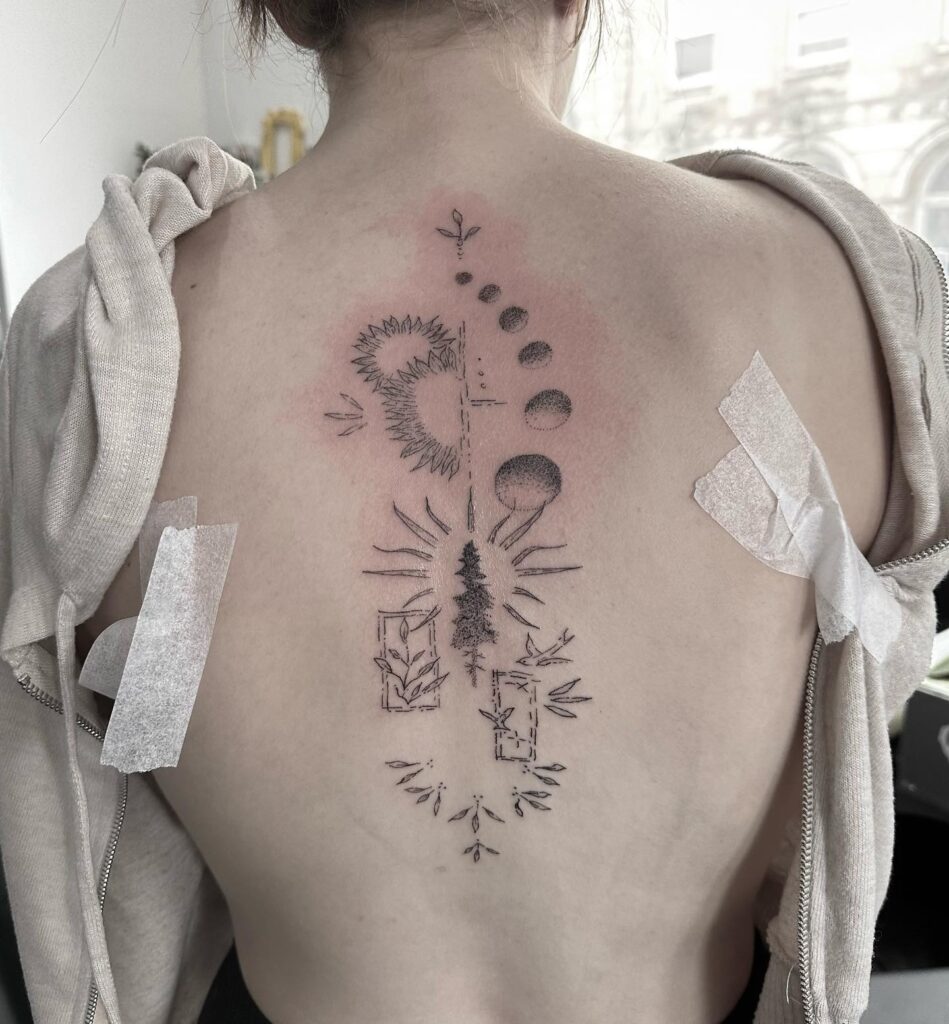 Placed along the spine, it follows the body’s natural flow and makes a striking central feature. This piece suits anyone seeking a graceful connection between earth and sky in one detailed tattoo.