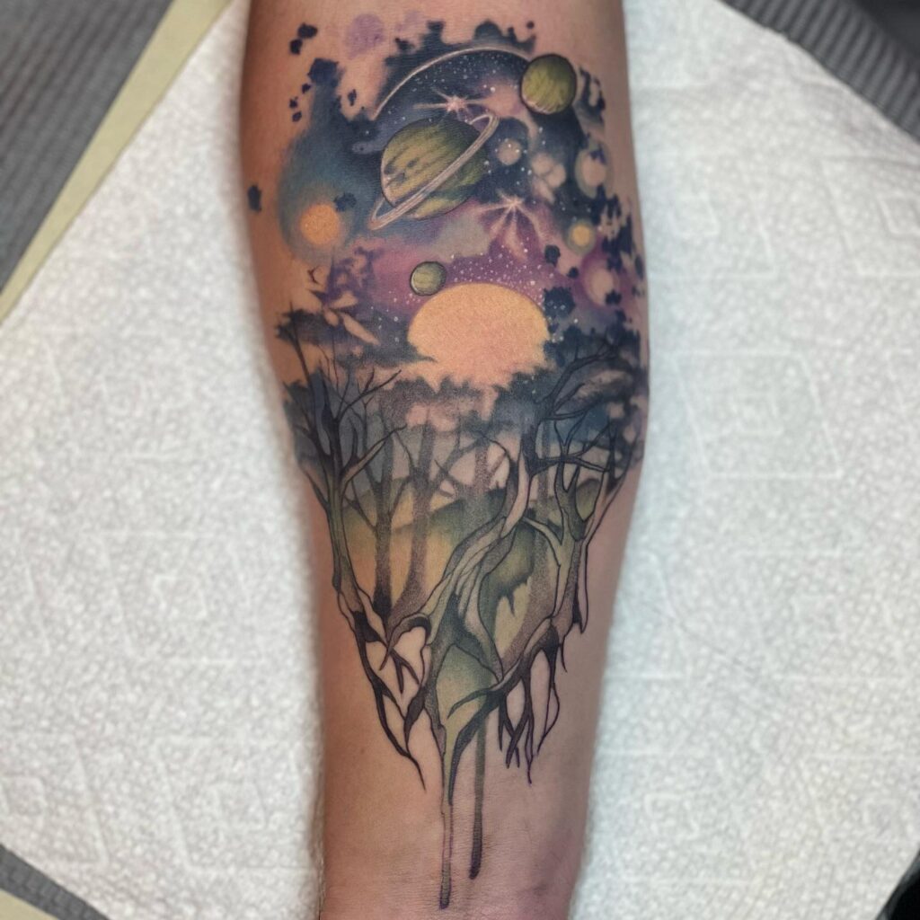 This tattoo blends a dreamy forest landscape with a vivid cosmic sky full of planets, rings, and glowing stars.