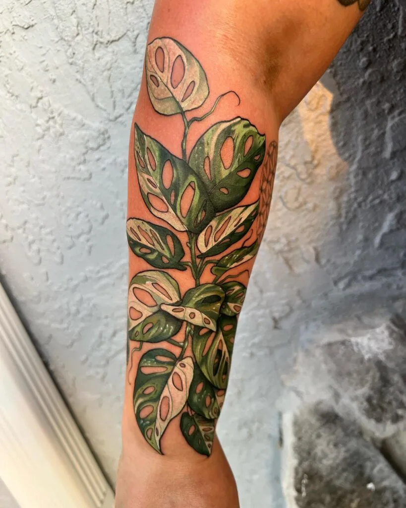 This tattoo highlights a lush variegated Monstera adansonii vine wrapping elegantly along the forearm.