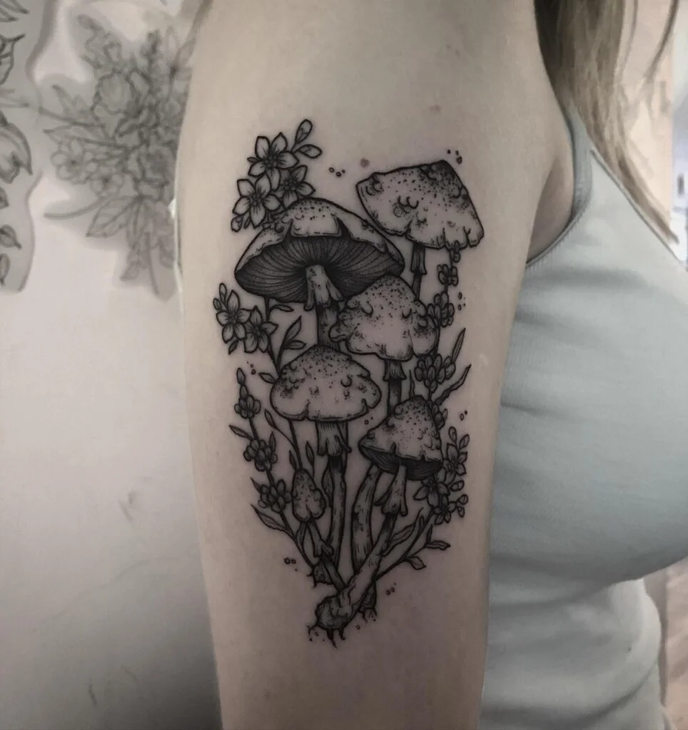 This tattoo features a lively cluster of wild mushrooms surrounded by small blossoms and leafy sprigs.