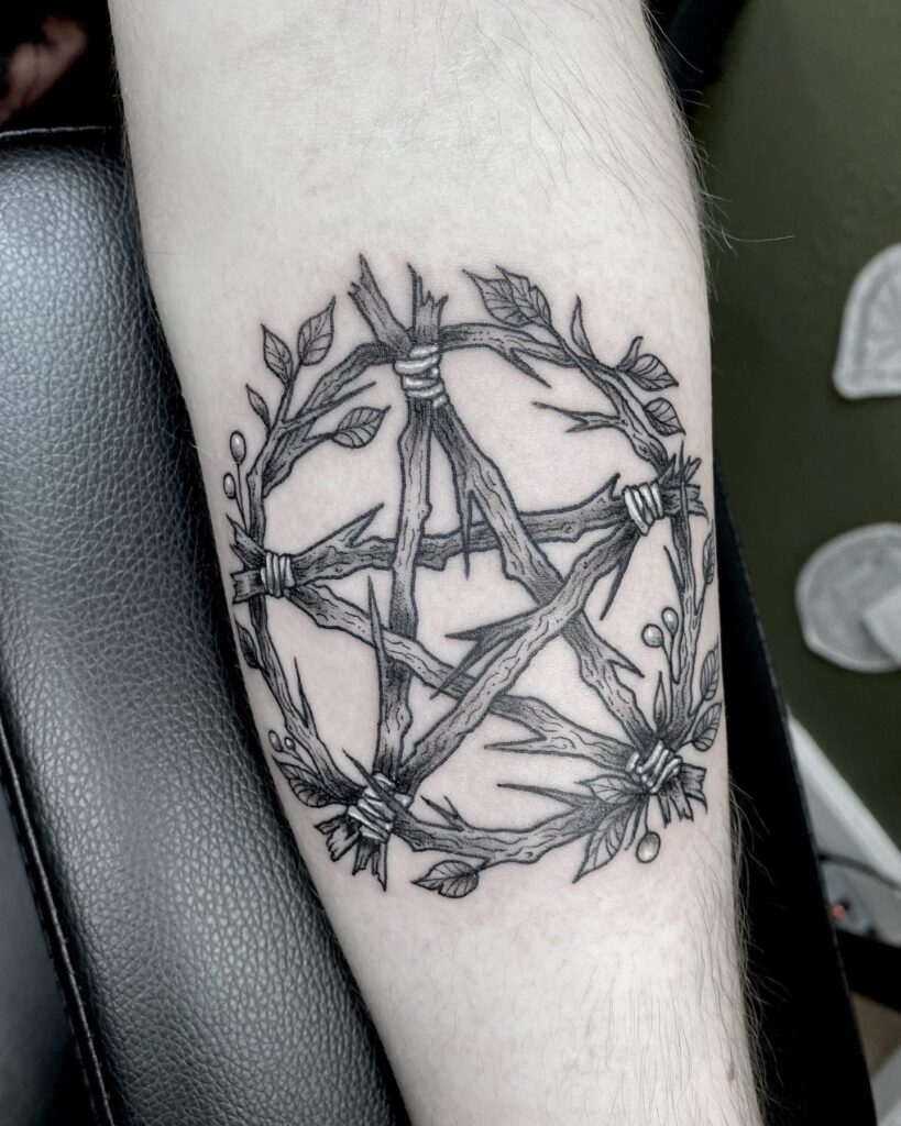 This tattoo depicts a rustic pentacle made of interlaced branches tied with twine and accented by leafy sprigs.