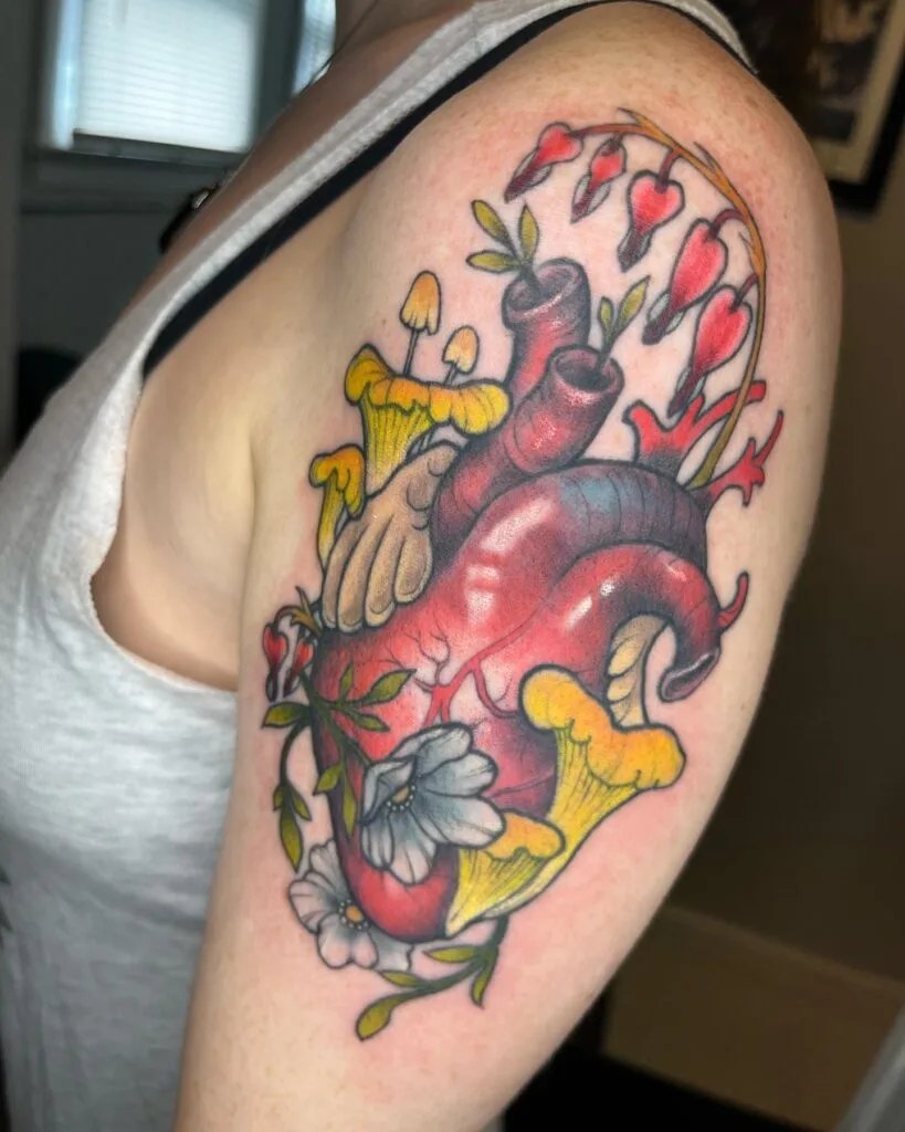 This tattoo blends a realistic red anatomical heart with forest elements like yellow mushrooms, bleeding heart flowers, and white blossoms.