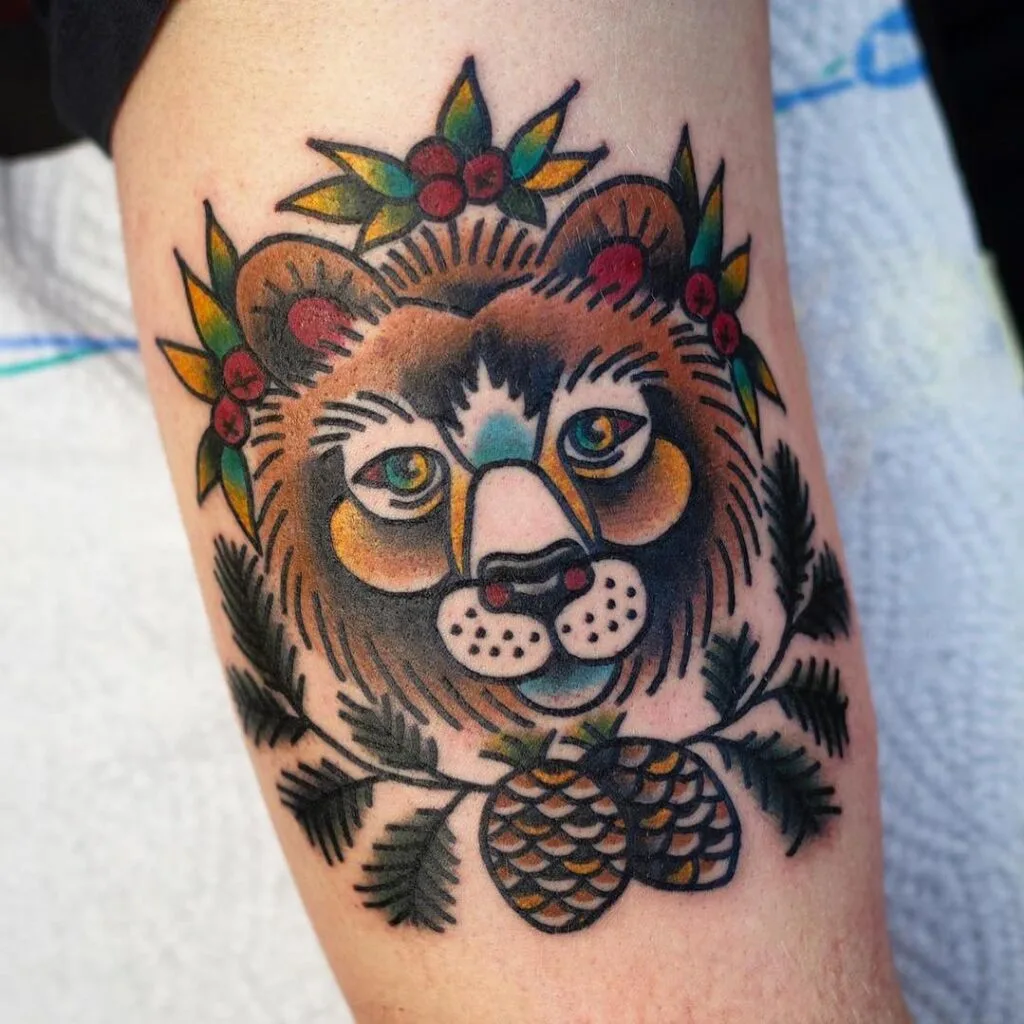 This tattoo features a bold bear head framed by pine branches, pinecones, and small red berries.