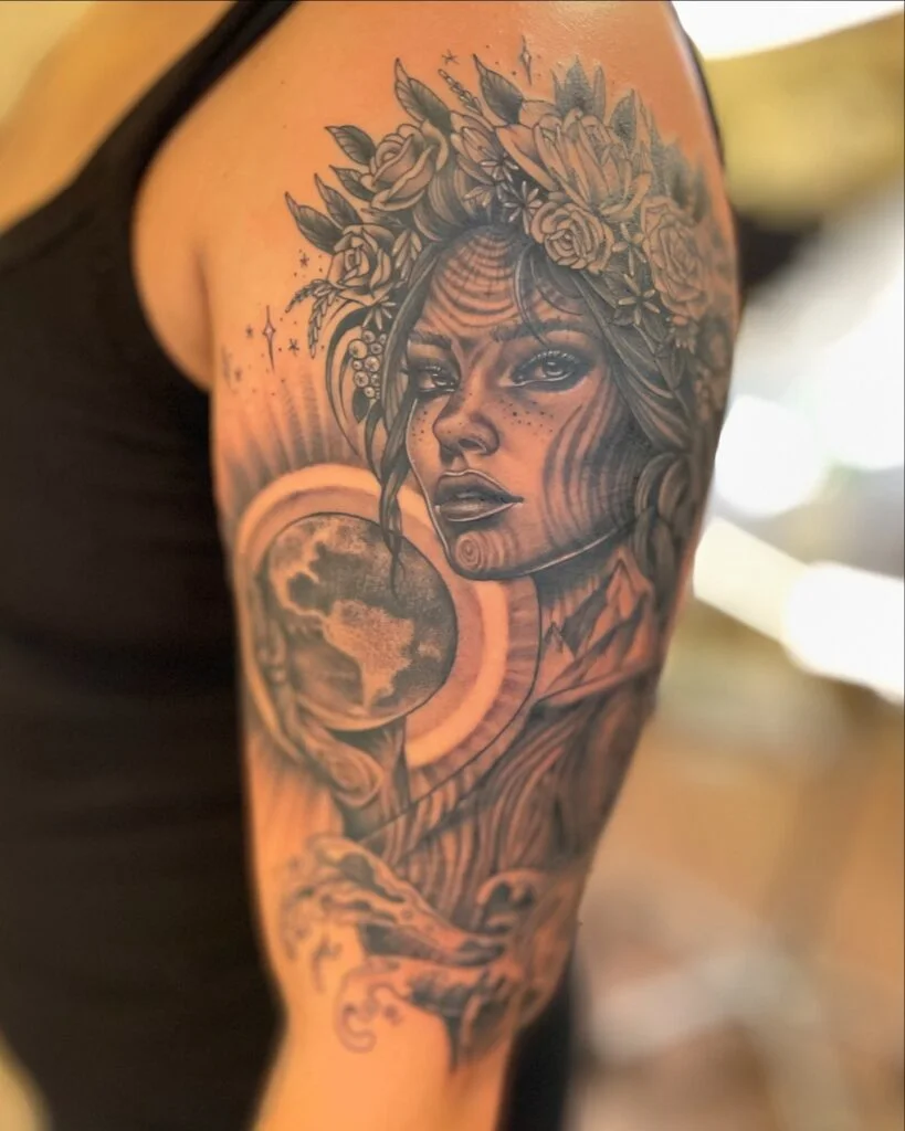 The tattoo highlights a graceful woman crowned with flowers, symbolizing Earth’s nurturing spirit and life’s eternal cycles. Detailed shading creates depth across her flowing hair, celestial patterns, and wooden-like facial textures.