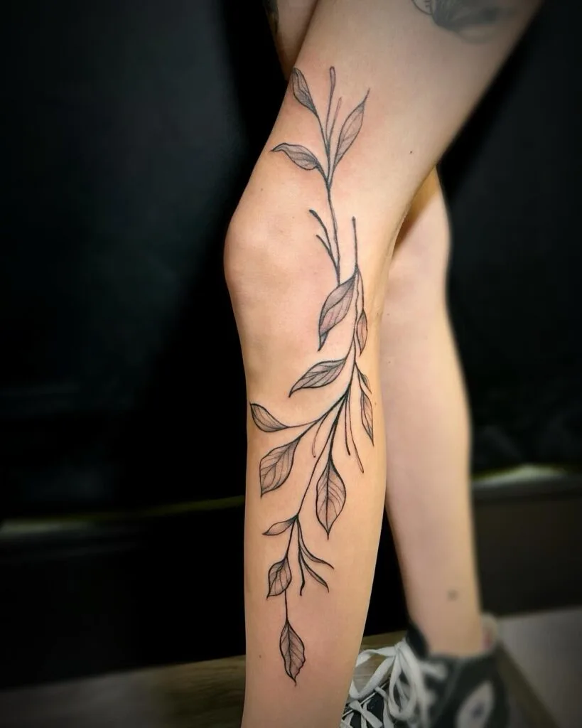Flowing Branch with Leaves Leg Tattoo