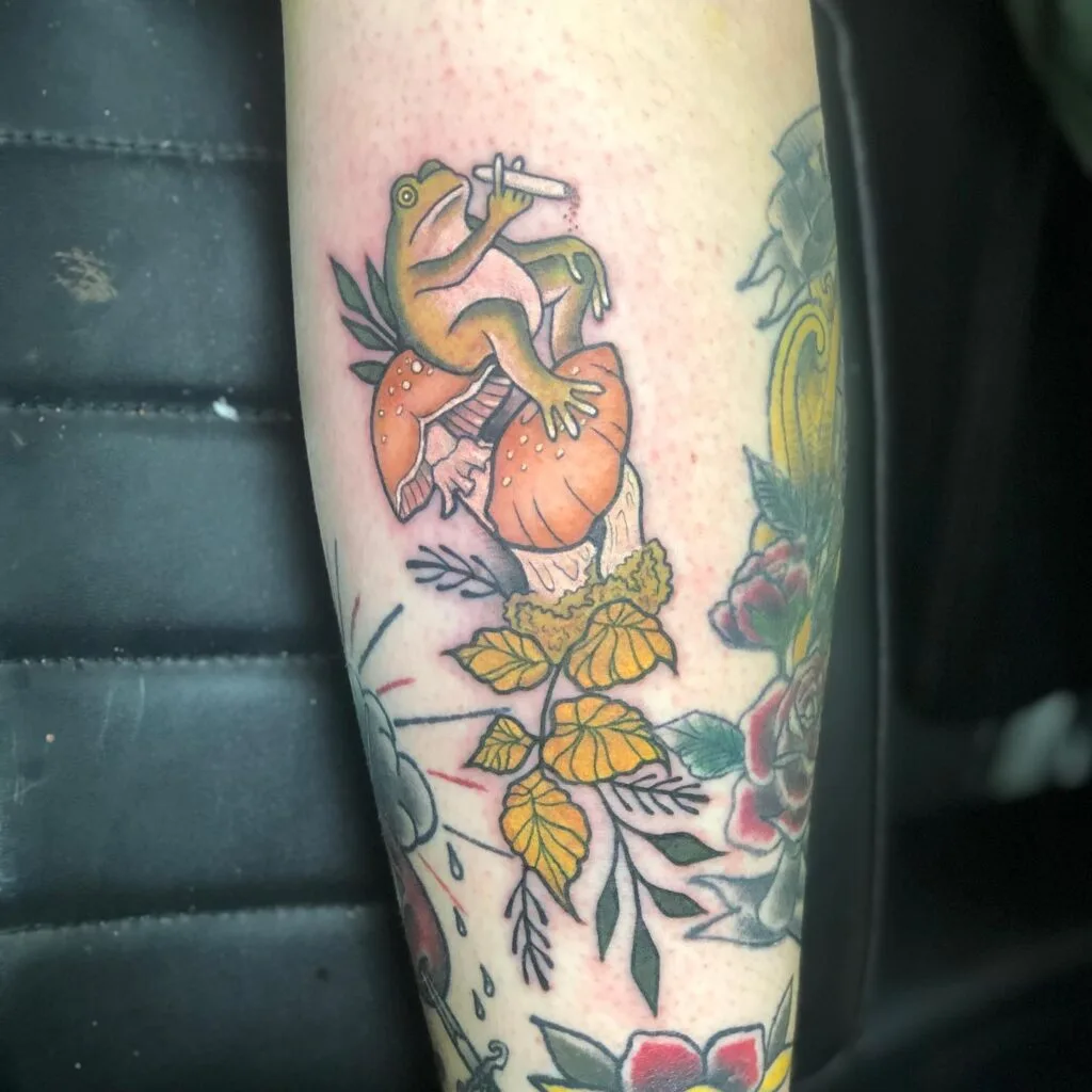 This tattoo features a playful green frog sitting on a bright orange mushroom, holding a lit cigarette.