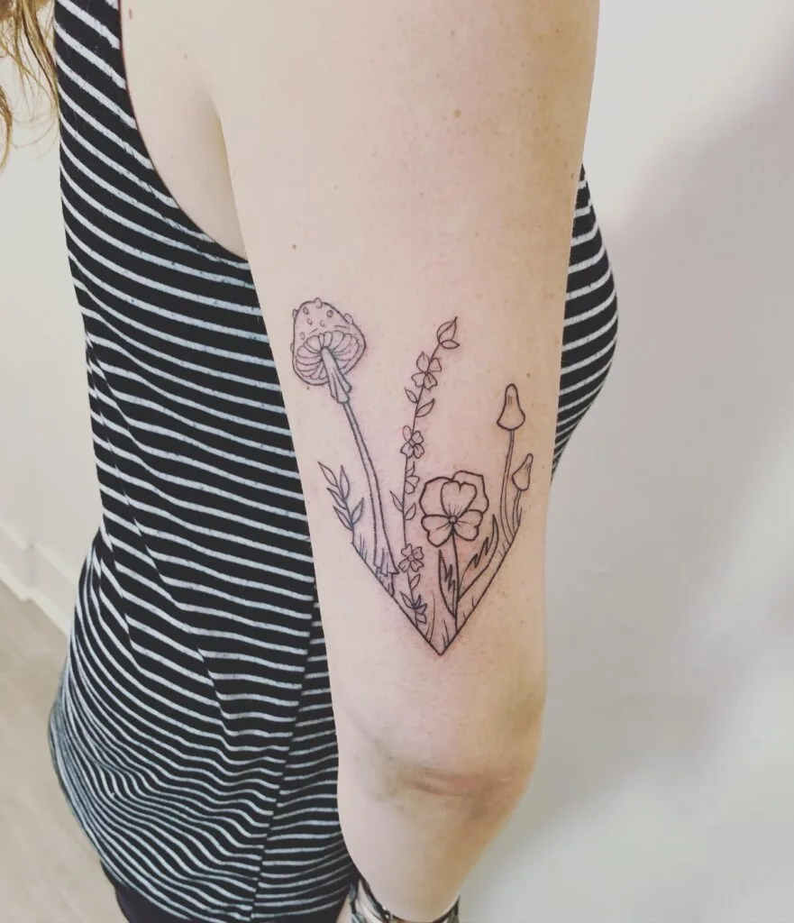 This tattoo combines a clean geometric V-shape with delicate wildflowers and mushrooms rising through it.