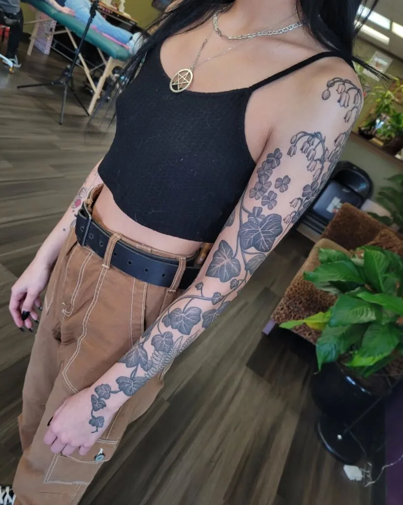 This piece suits anyone wanting a nature-inspired tattoo that combines detailed botanicals with a graceful, continuous flow from shoulder to wrist.