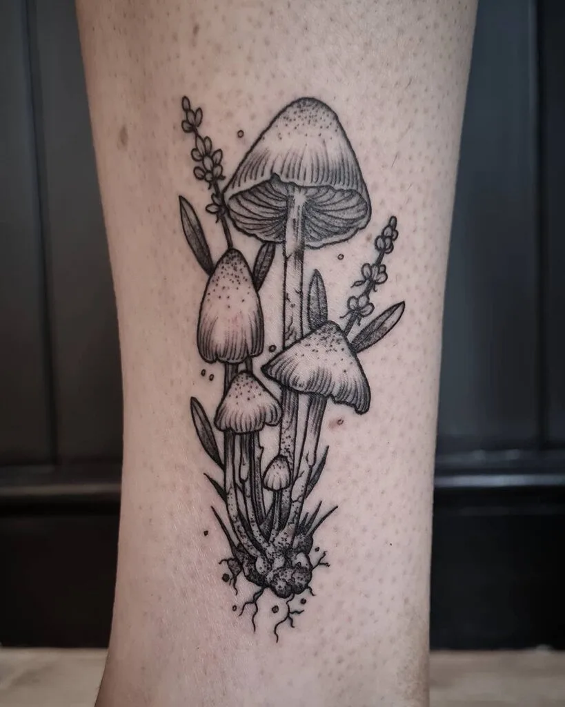 You’ll notice the fine linework showing delicate gills, adding natural depth to the design. Small branches frame the fungi, creating movement and balance. You can wear this earthy piece on your calf, forearm, or upper arm for maximum effect.